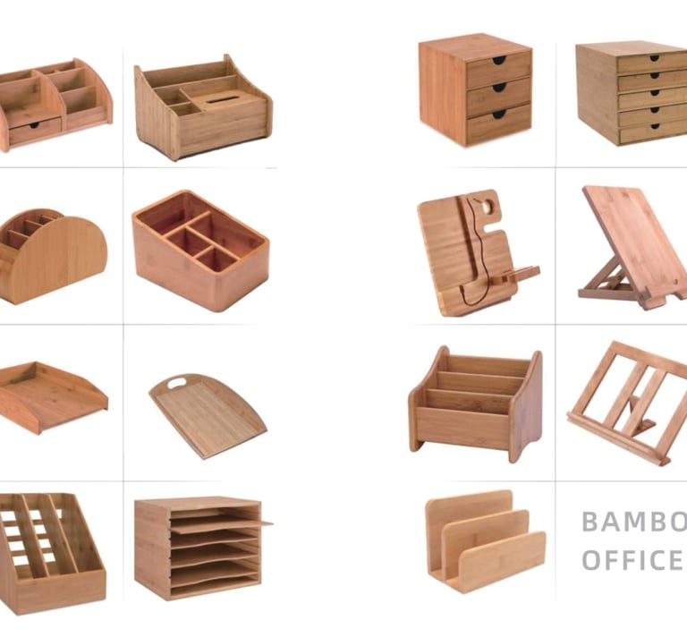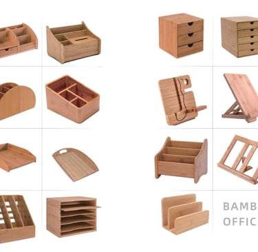 Produtos de escritório feitos de bambu de alta qualidade e com diferentes designs.