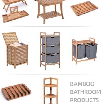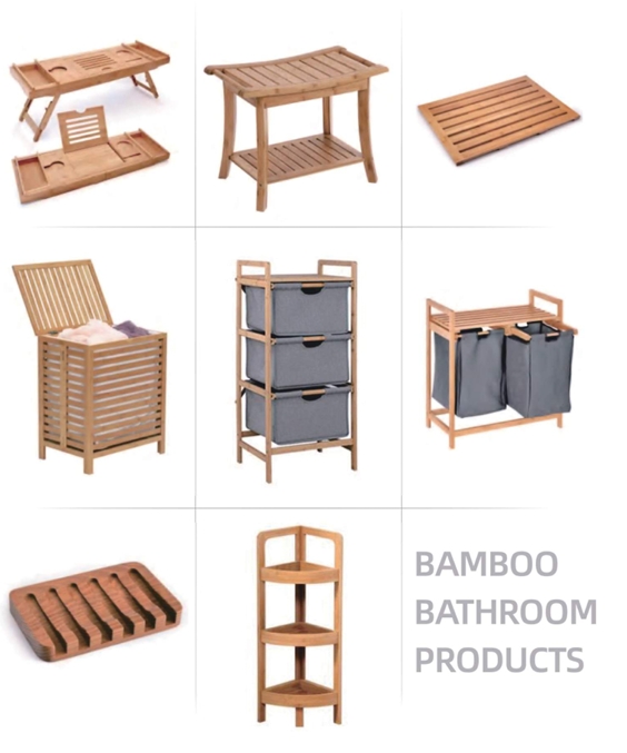 Produtos variados de banho feitos de bambu de alta qualidade e com diferentes designs.