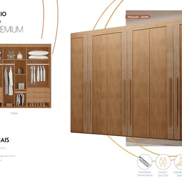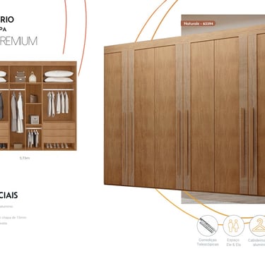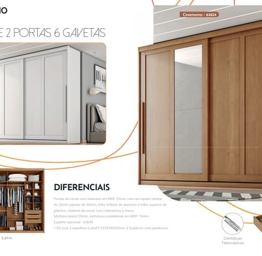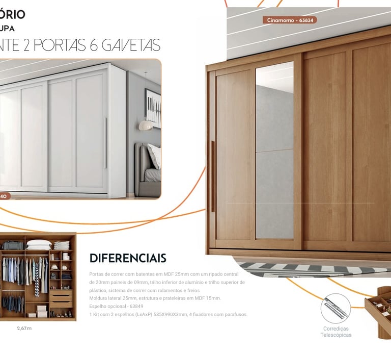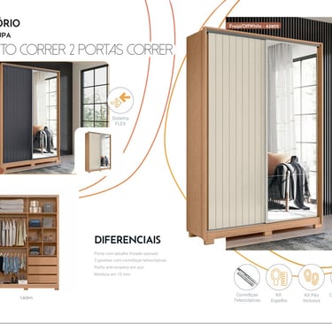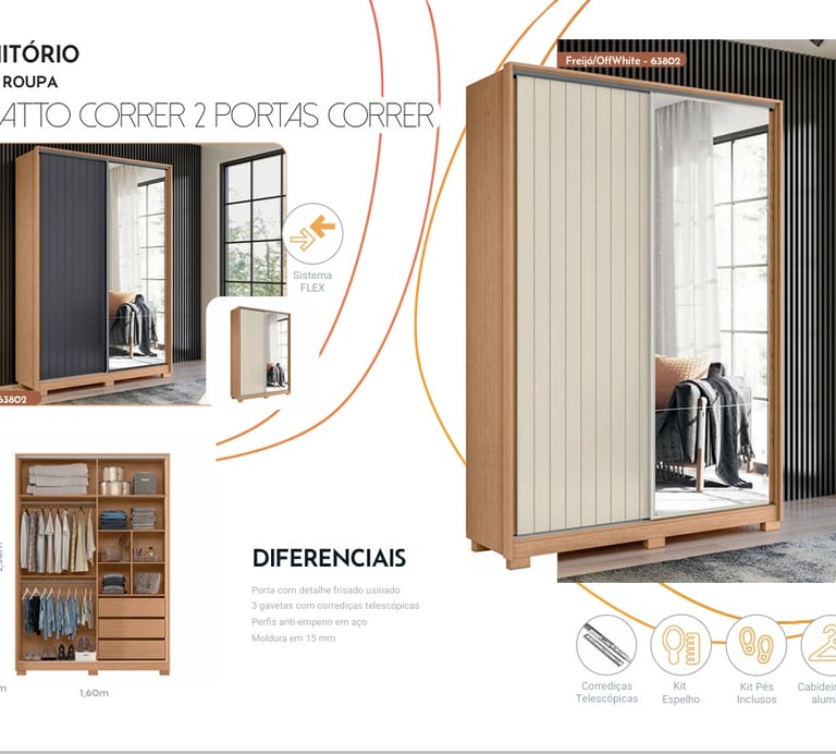 Puertas correderas con marcos de MDF de 25mm con un listón central de 20mm, paneles de 9mm, riel inferior de aluminio y riel superior de plástico, sistema corredizo con rodamientos y frenos. Marco lateral de 25mm, estructura y estantes en MDF de 15mm. Espejo opcional - 63849. 1 kit con 2 espejos (LxAxP) 535X990X3mm, 4 fijadores con tornillos